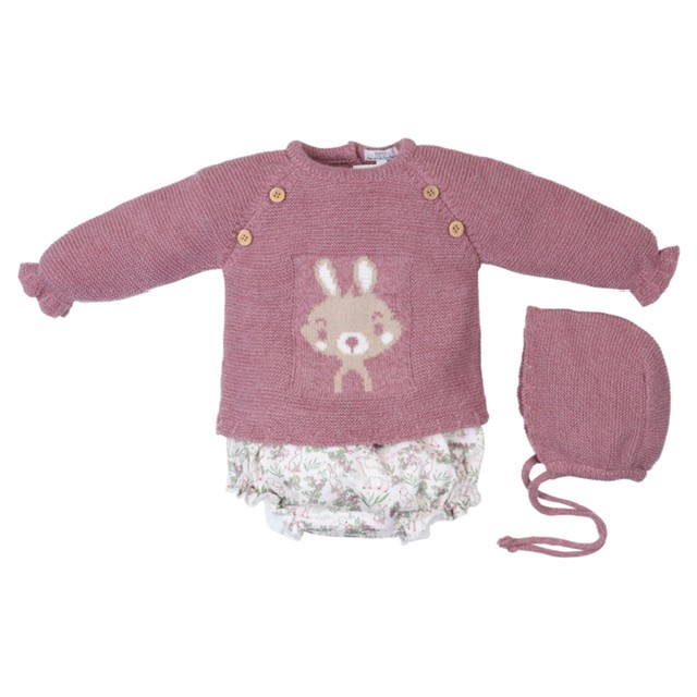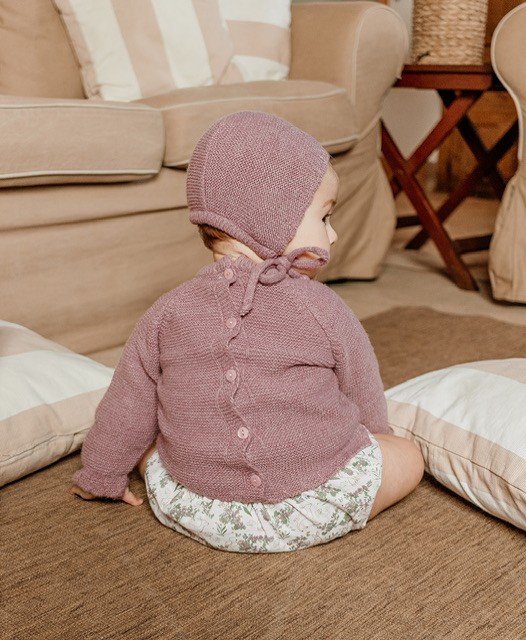 Jersey y capota de lana en color morado con estampado conejito. Botones decorativos.
