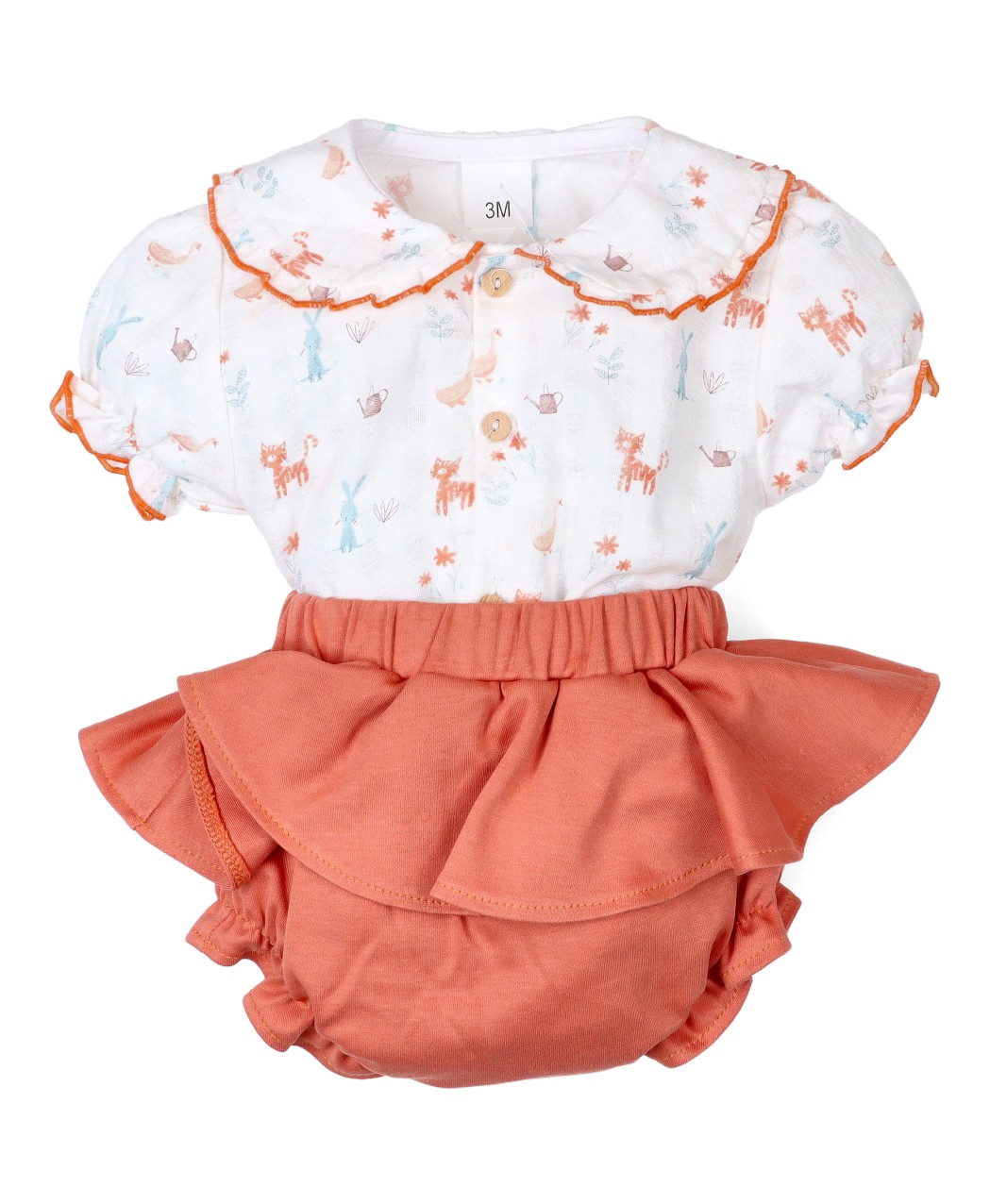 Camisa con tejido muy fluido en color blanco y estampado de gatitos en teja. Detalle cuello bebé y manga farol.