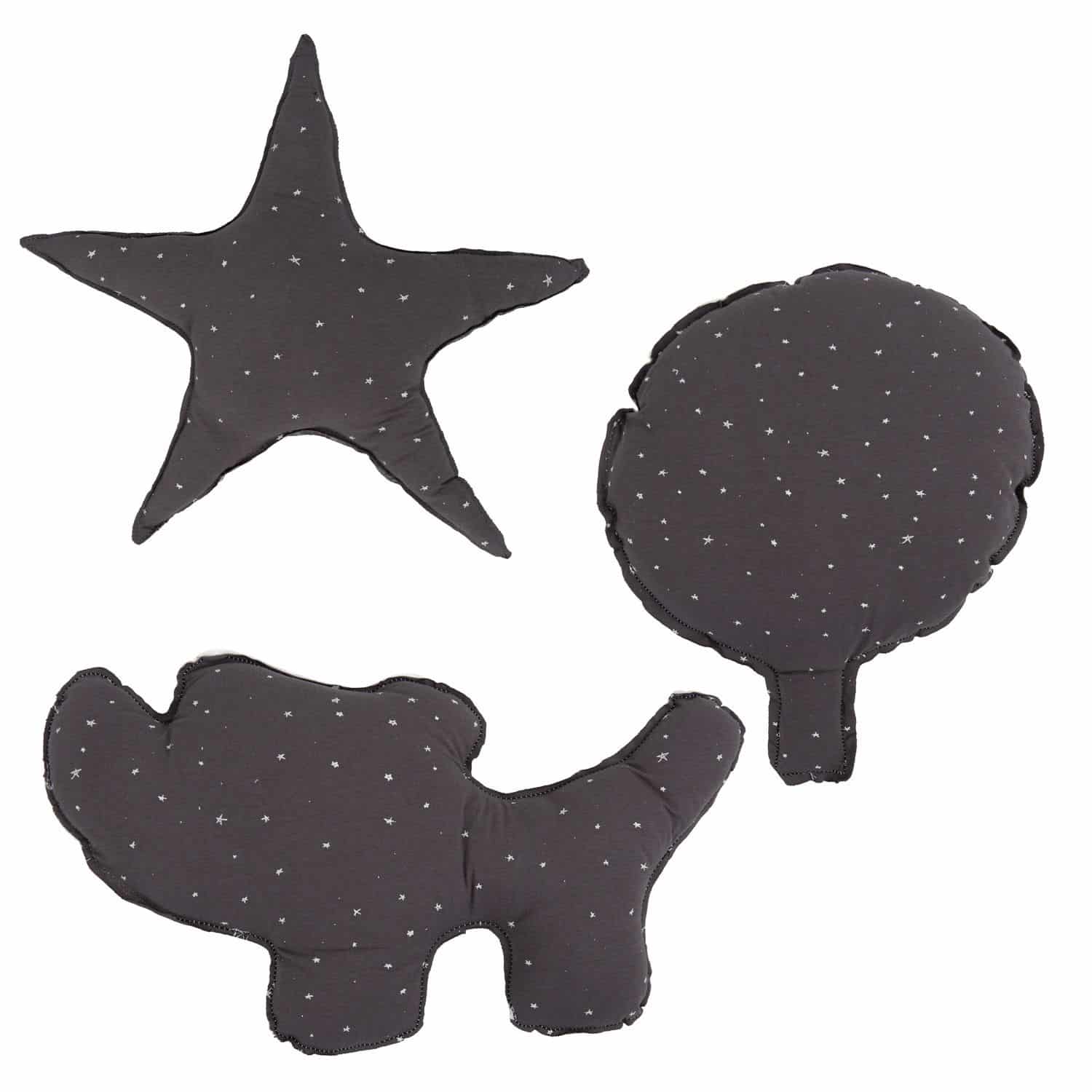 Set 3 cojines con formas en tonos gris oscuro y blanco.