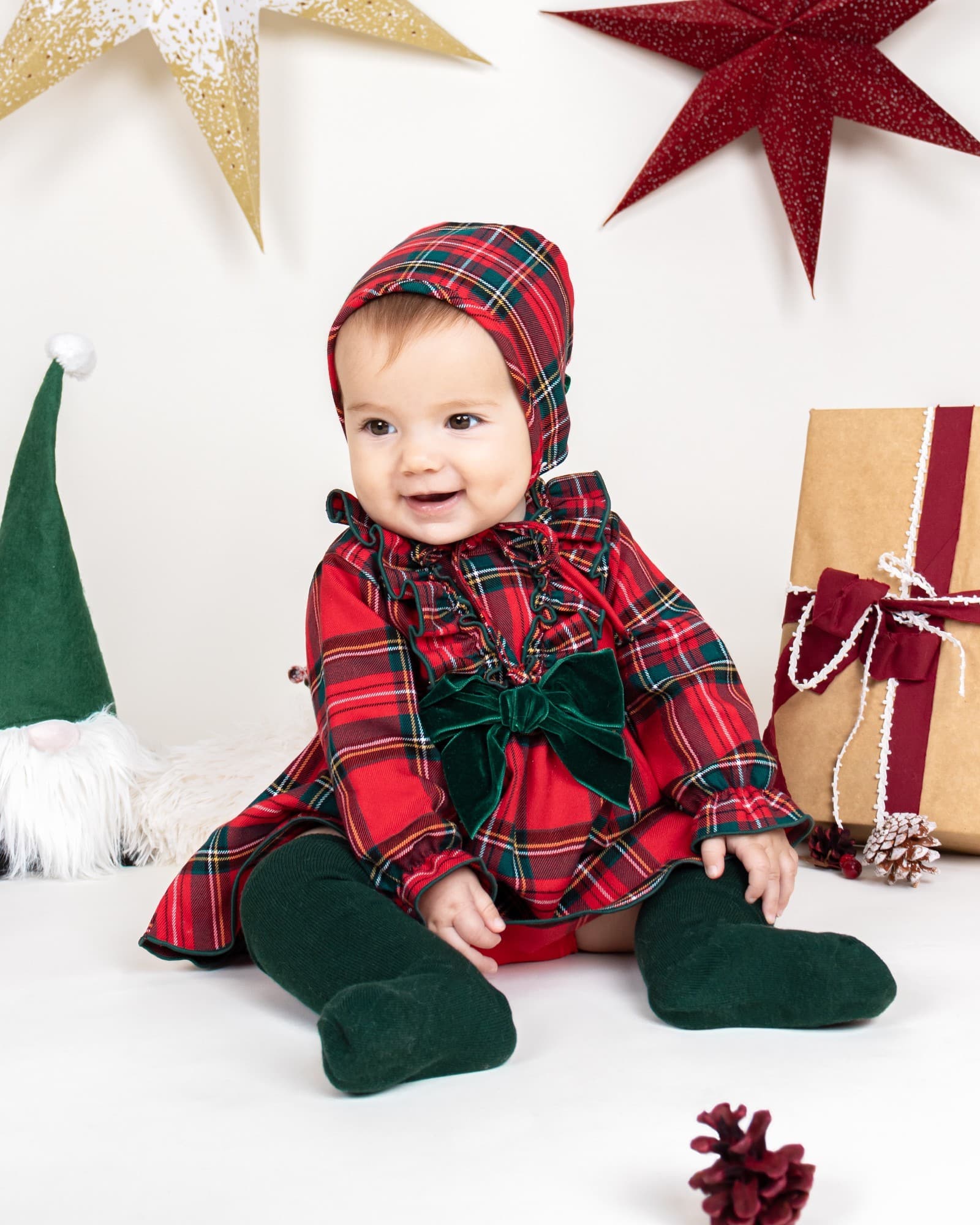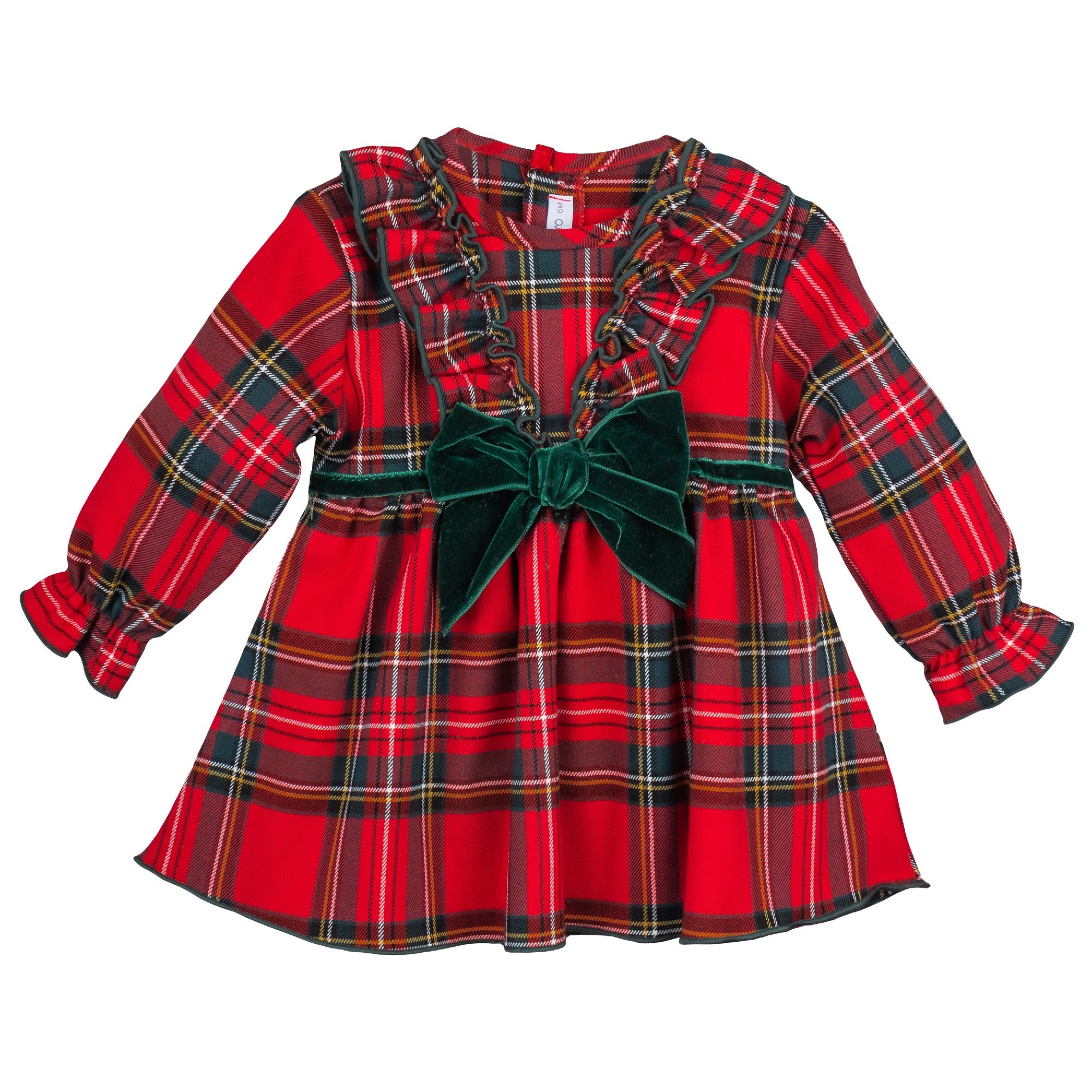 Vestido de algodón de color rojo con estampado de cuadros en verde botella. Detalle volantes y lazo de terciopelo verde en el pecho.