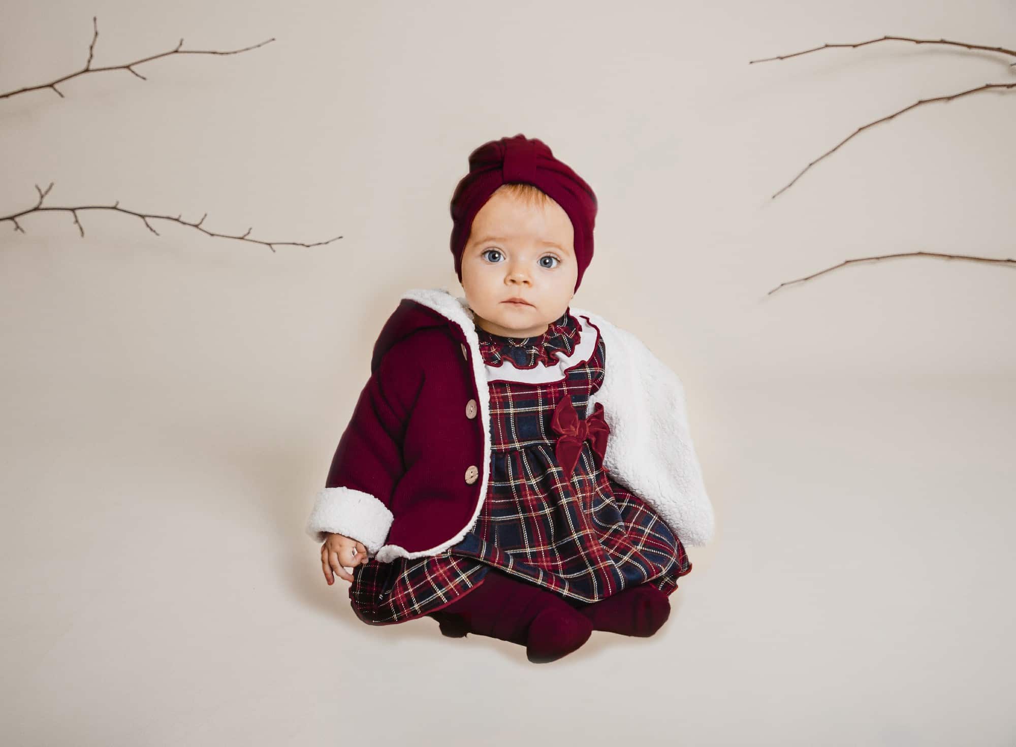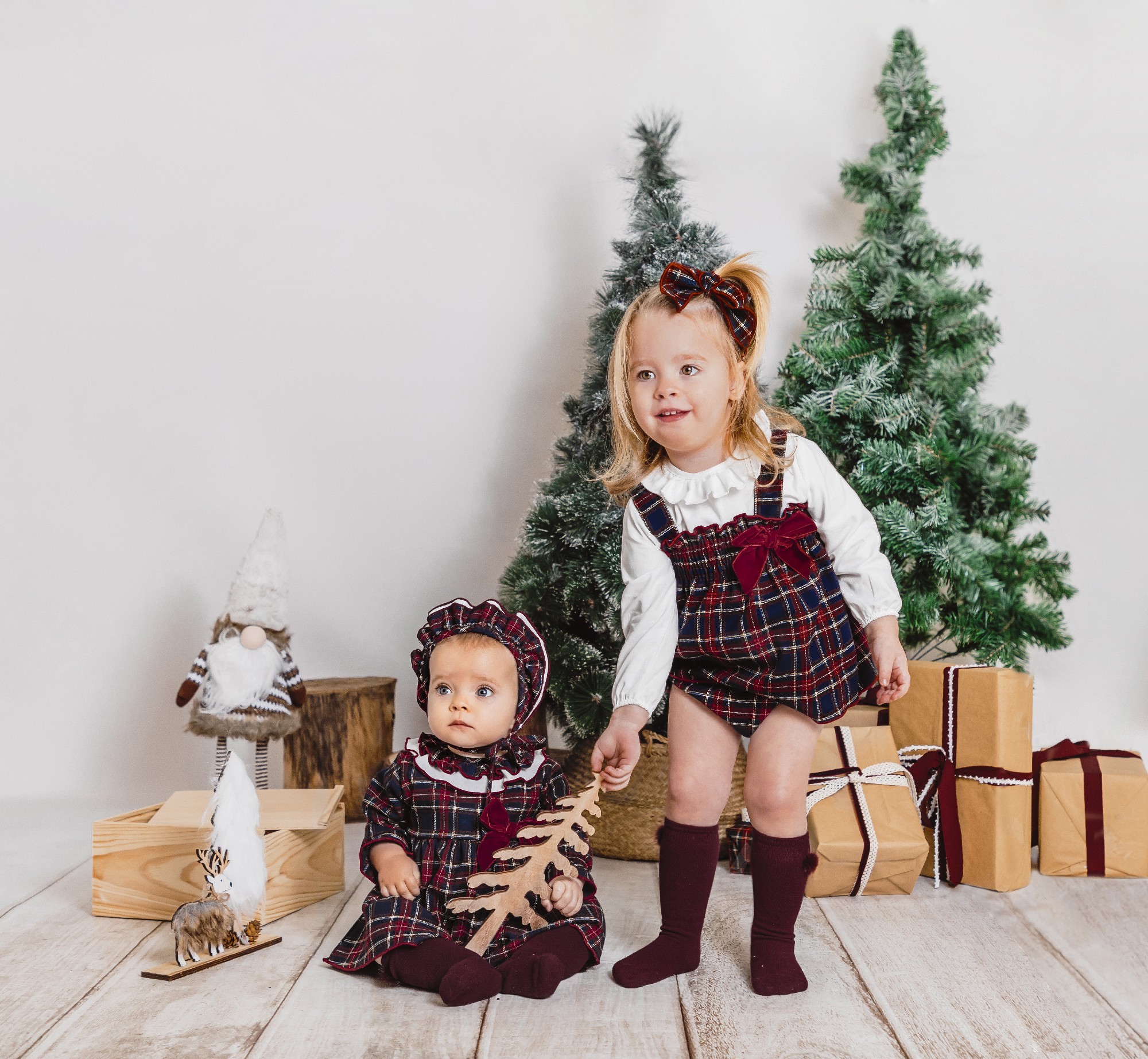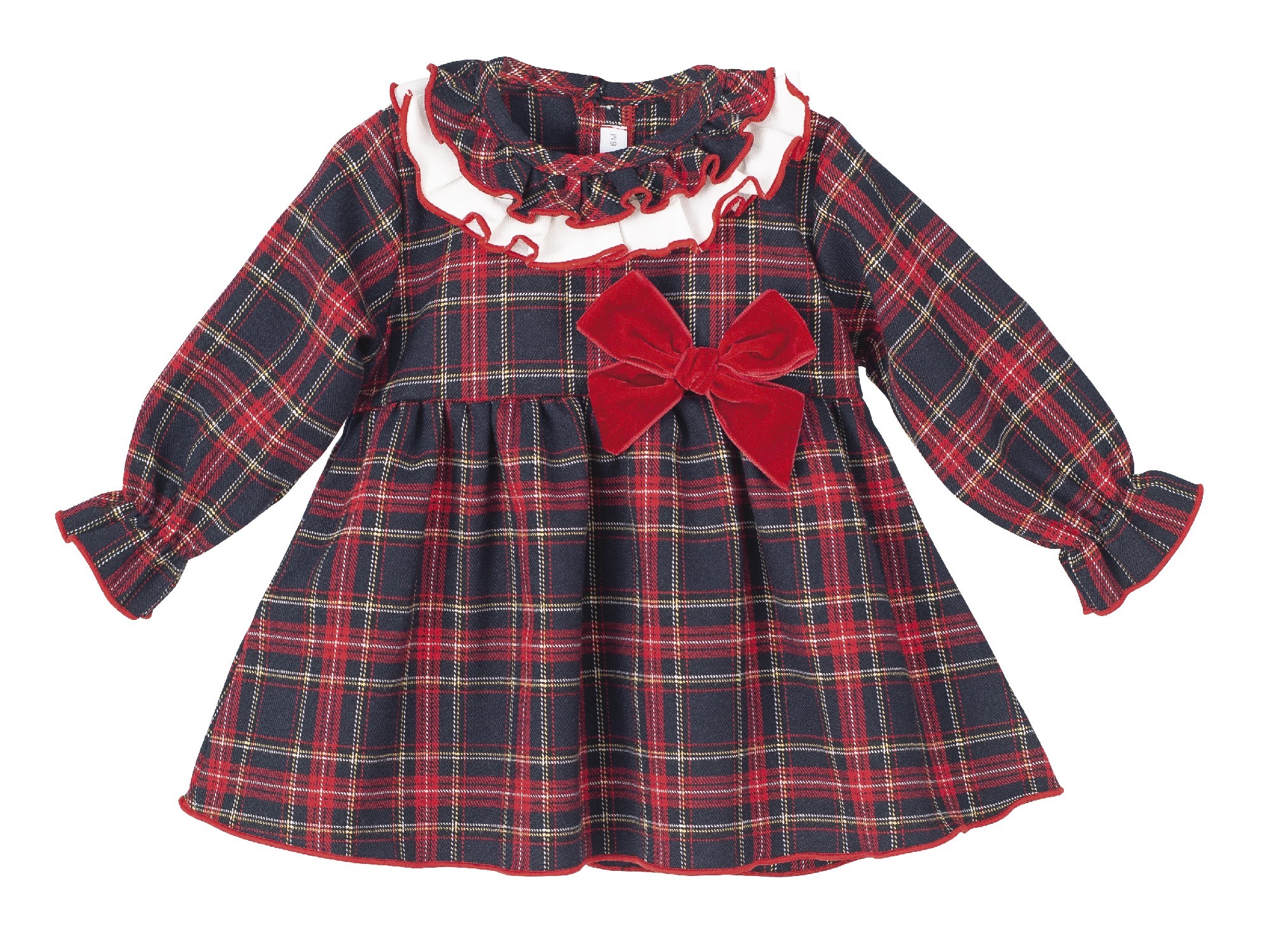 Vestido con estampado cuadro escocés en color rojo y azul marino. Detalle volante doble en el cuello y lazo de terciopelo rojo.