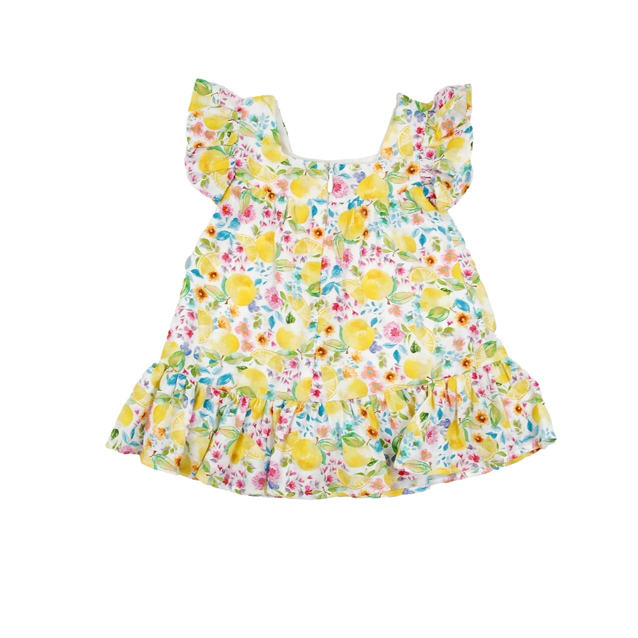 Vestido con estampado de limones de color amarillo. Detalle volante en los hombros.