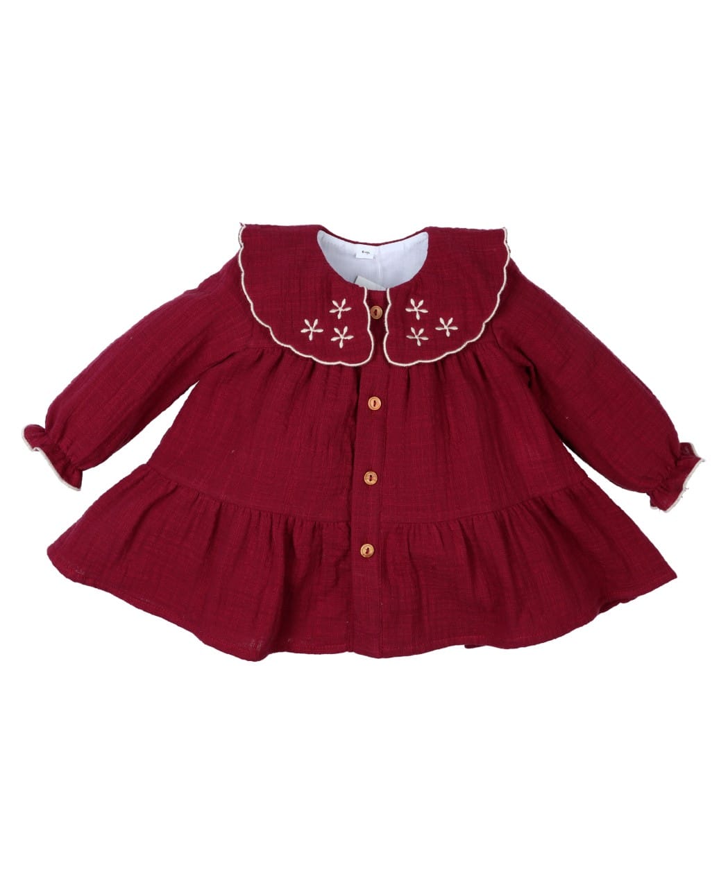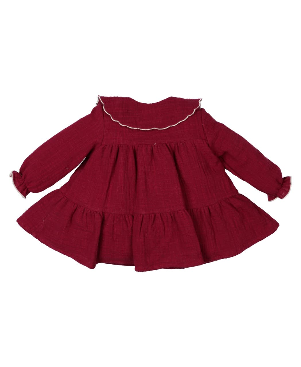 Vestido de color granate en tejido bambula con detalles bordados en el cuello en color lino.