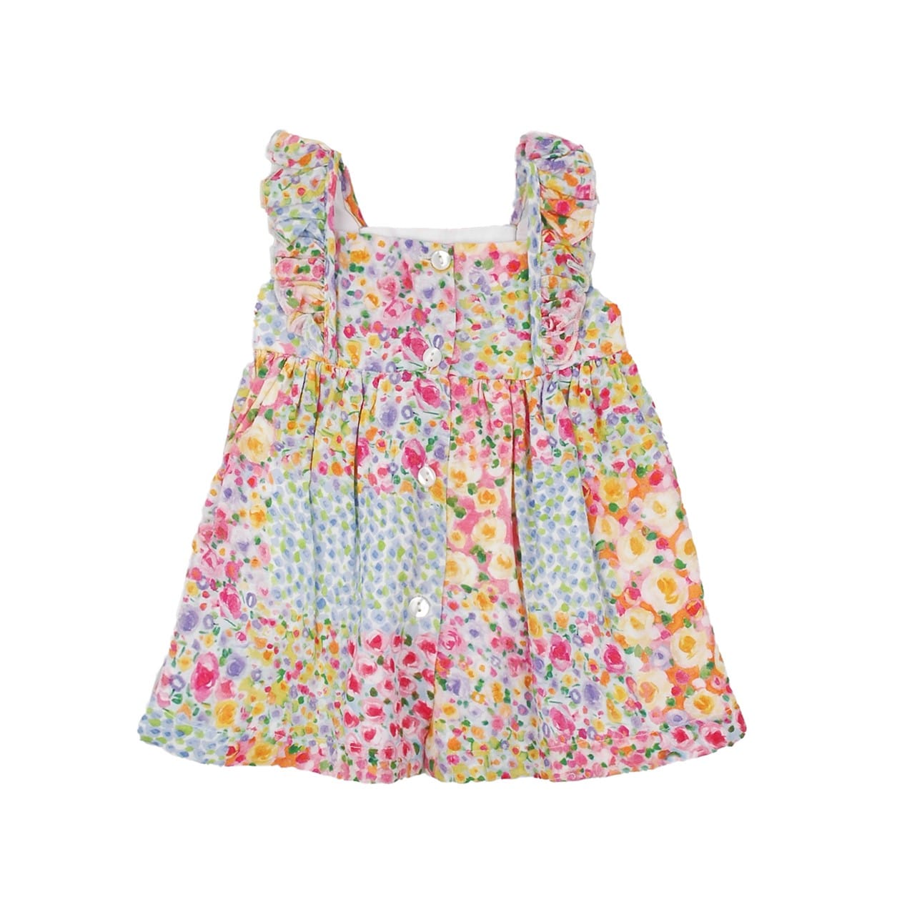 Vestido de tejido fluido con estampado de flores de colores. Detalle volante en los tirantes.